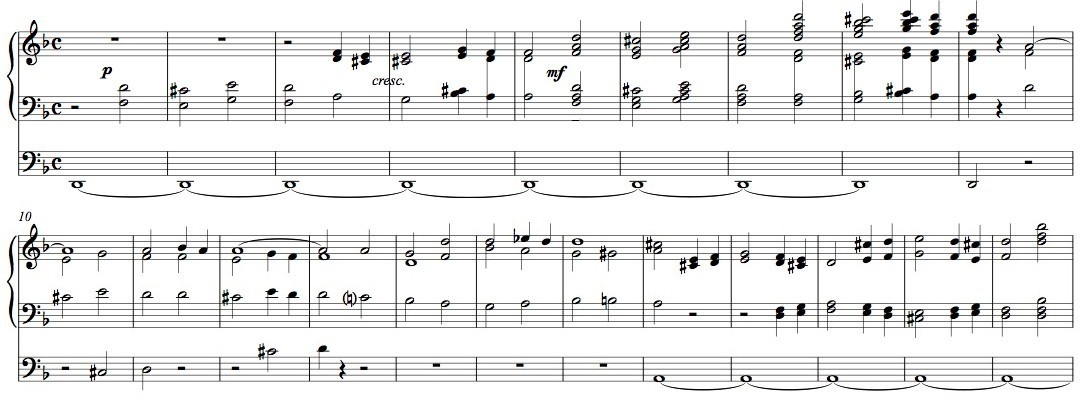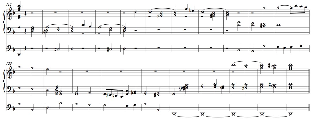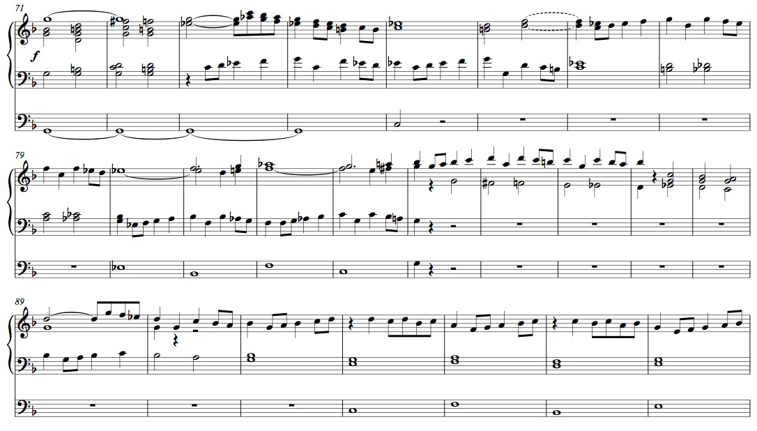Perussävellajin jälkeen siirryttiin rinnakkaissävellajiin, F-duuriin, jota puolestaan seuraa dramaattinen g-mollihuipennus, fuugaa muistuttava jakso: